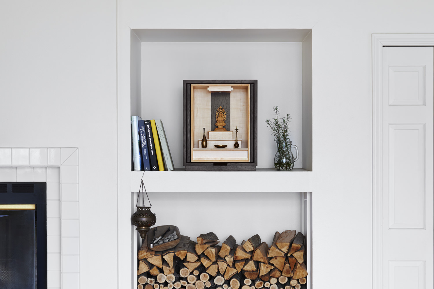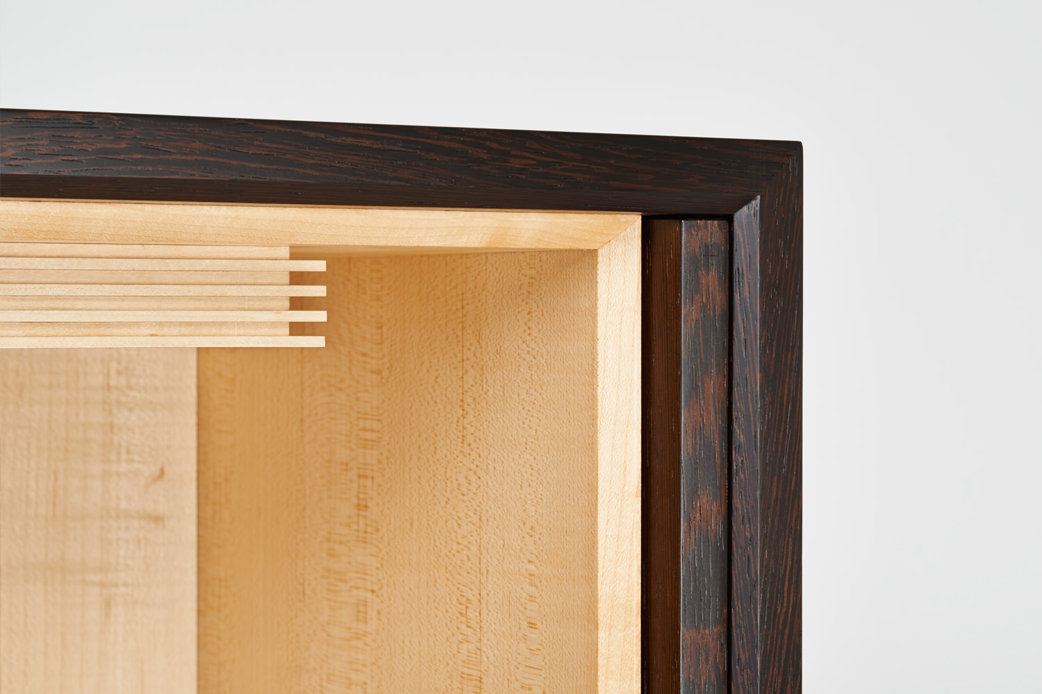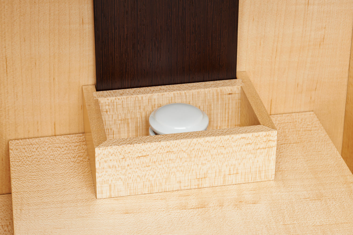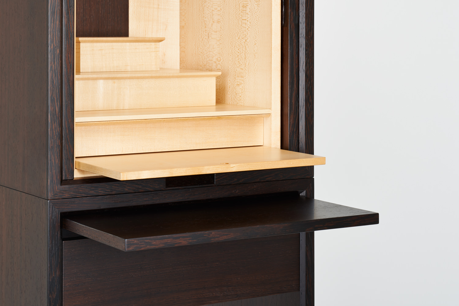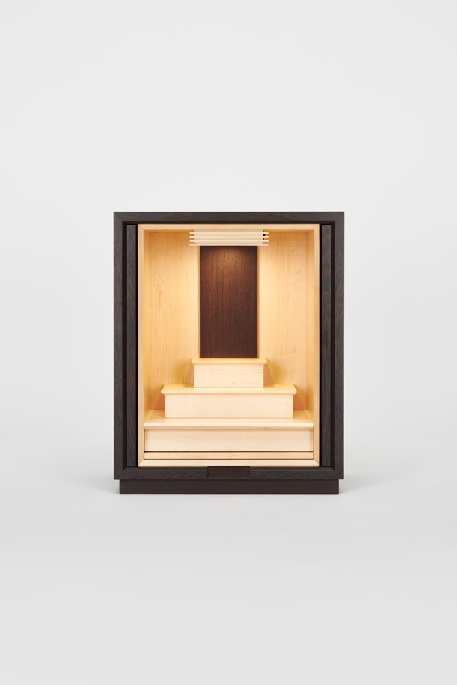 落ち着いた色味のウェンジ材とメープル材の明快なコントラストが手を合わせる人の気持ちを切り変えてくれます。須弥壇の最上段は、取り外しができ蓋を開けて骨壺や、遺品を入れておけるスペースになっています。