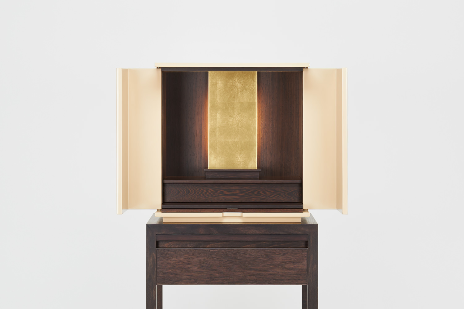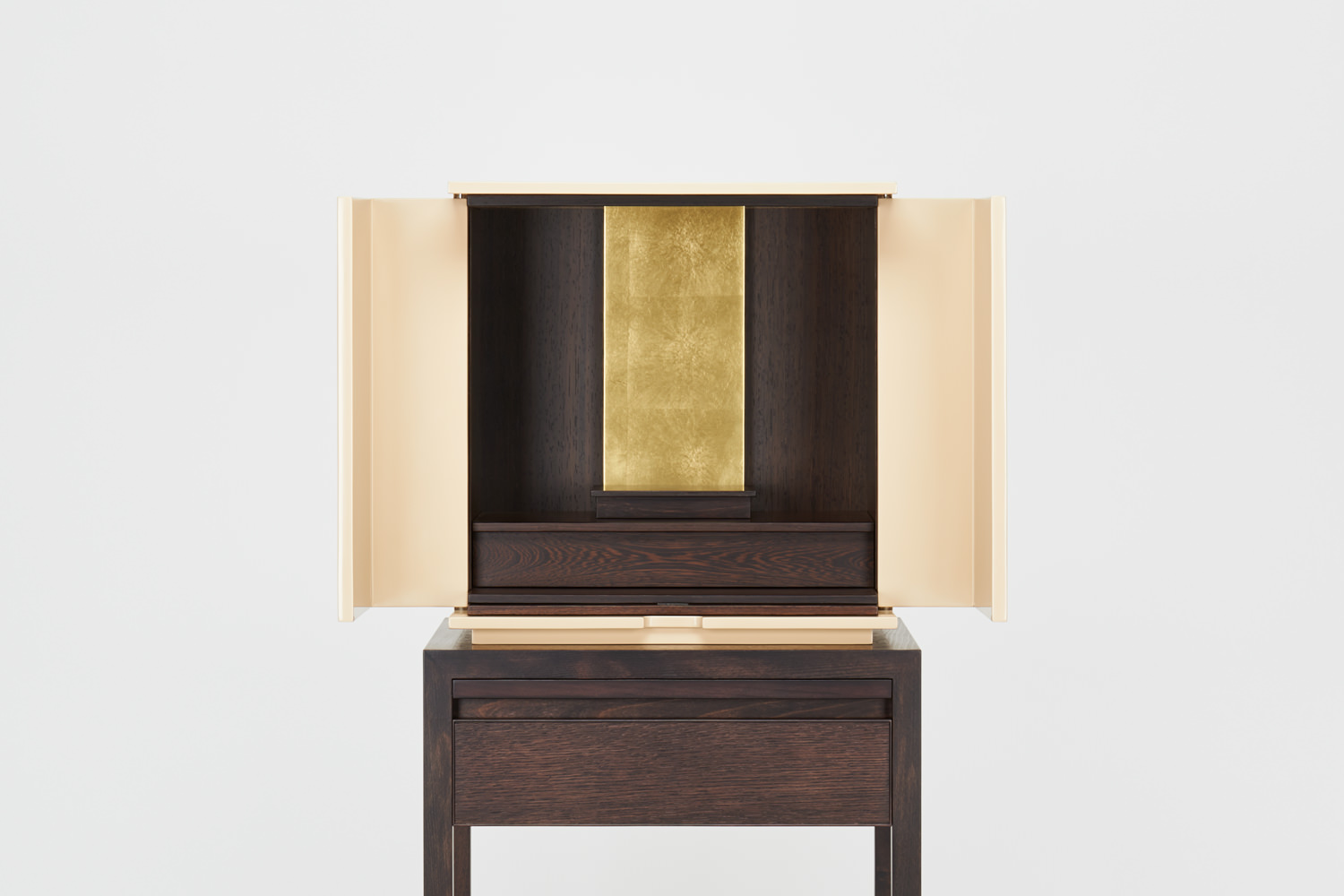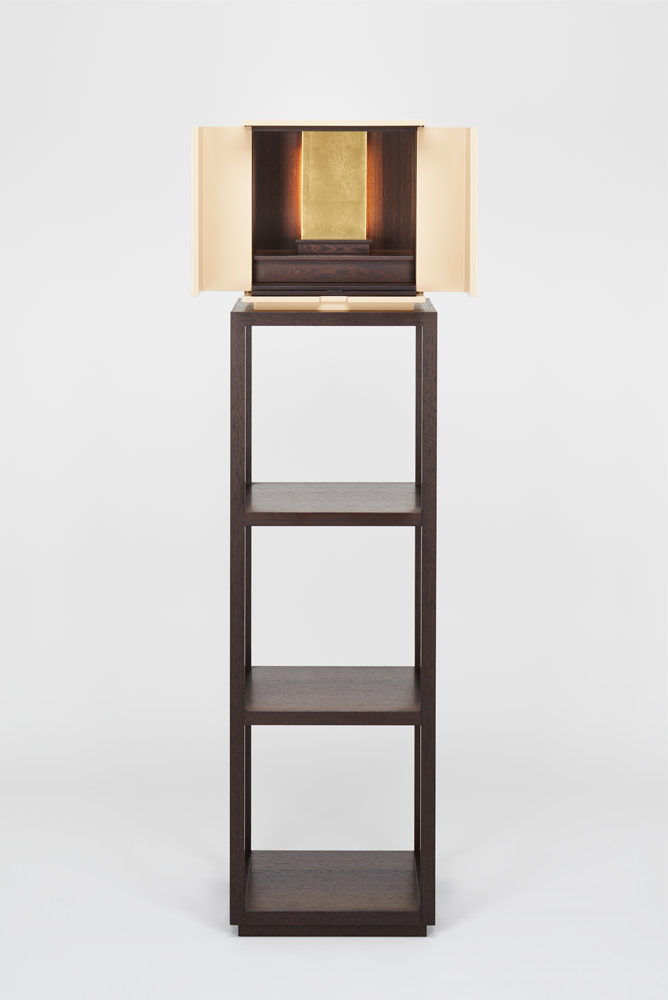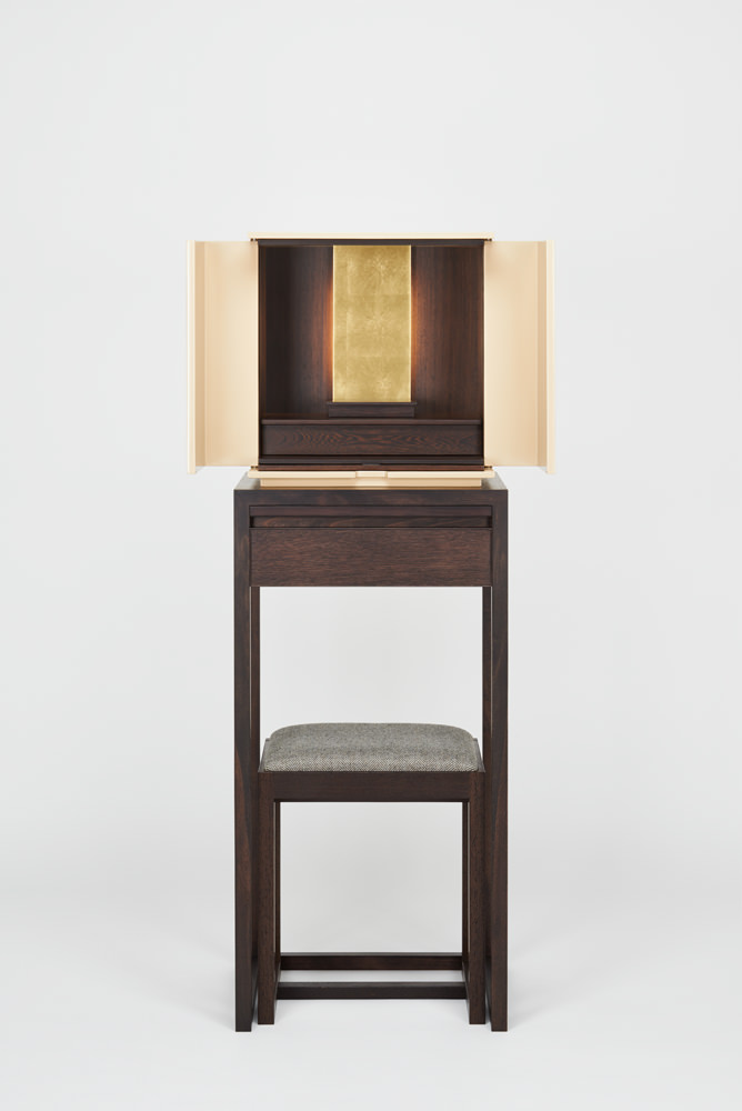 漆の色味が生きた落ち着きのある白漆は、和から洋にいたるさまざまな空間にしっくりと馴染み、漆の光沢が豊かさを与えてくれます。須弥壇は引き出しになっており、骨壺やお線香、ローソクなどを収納できます。向板は、金箔とウェンジ材の両面仕立てで、お客様の宗派や好みに合わせて変えることができます。