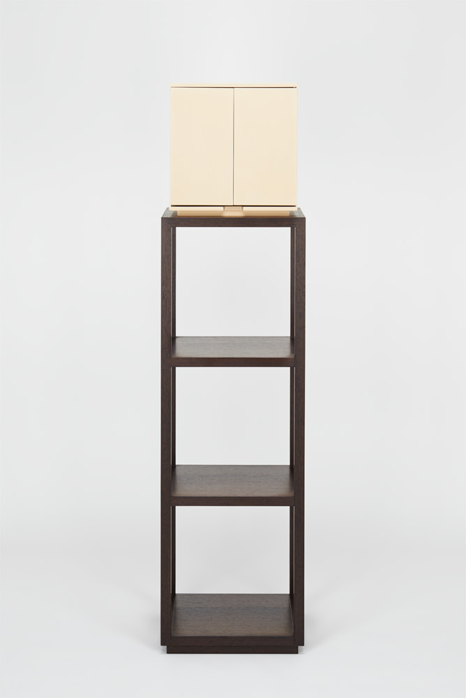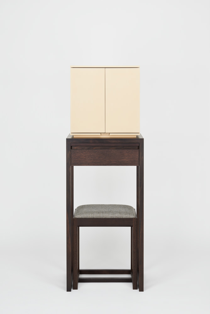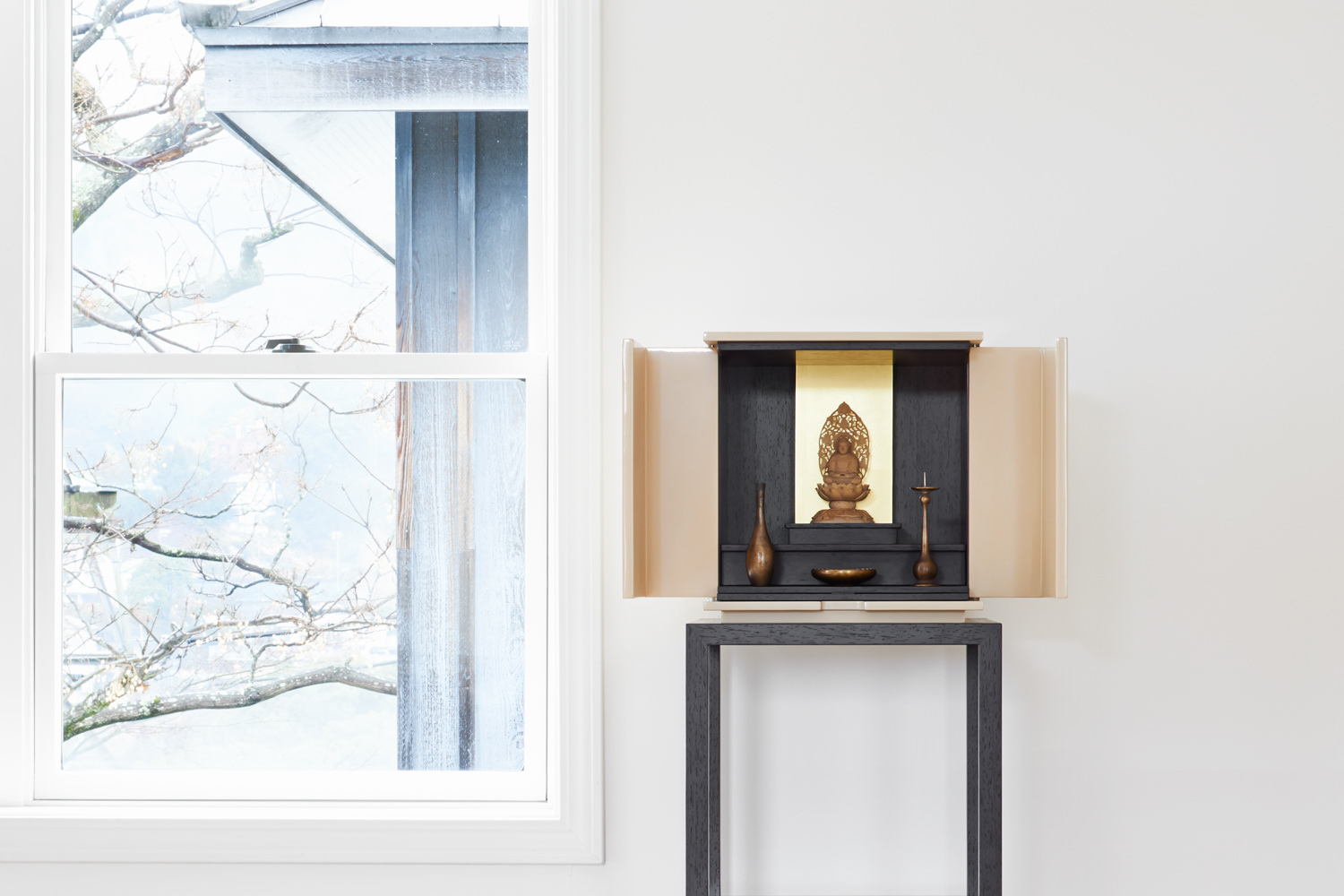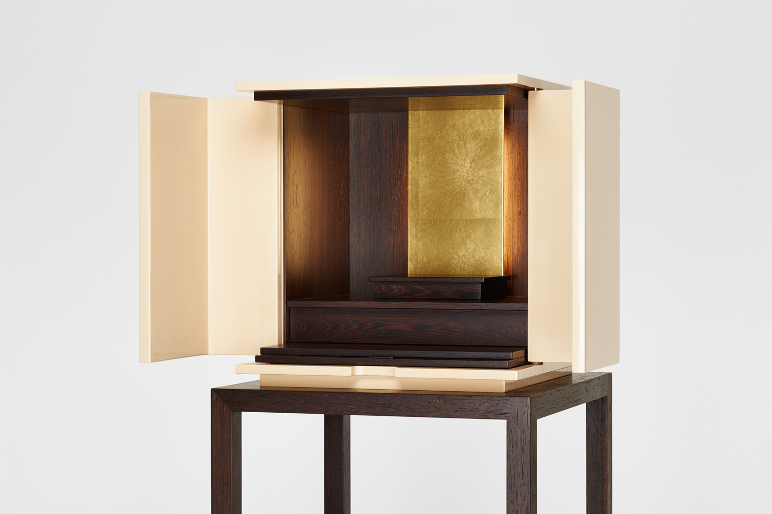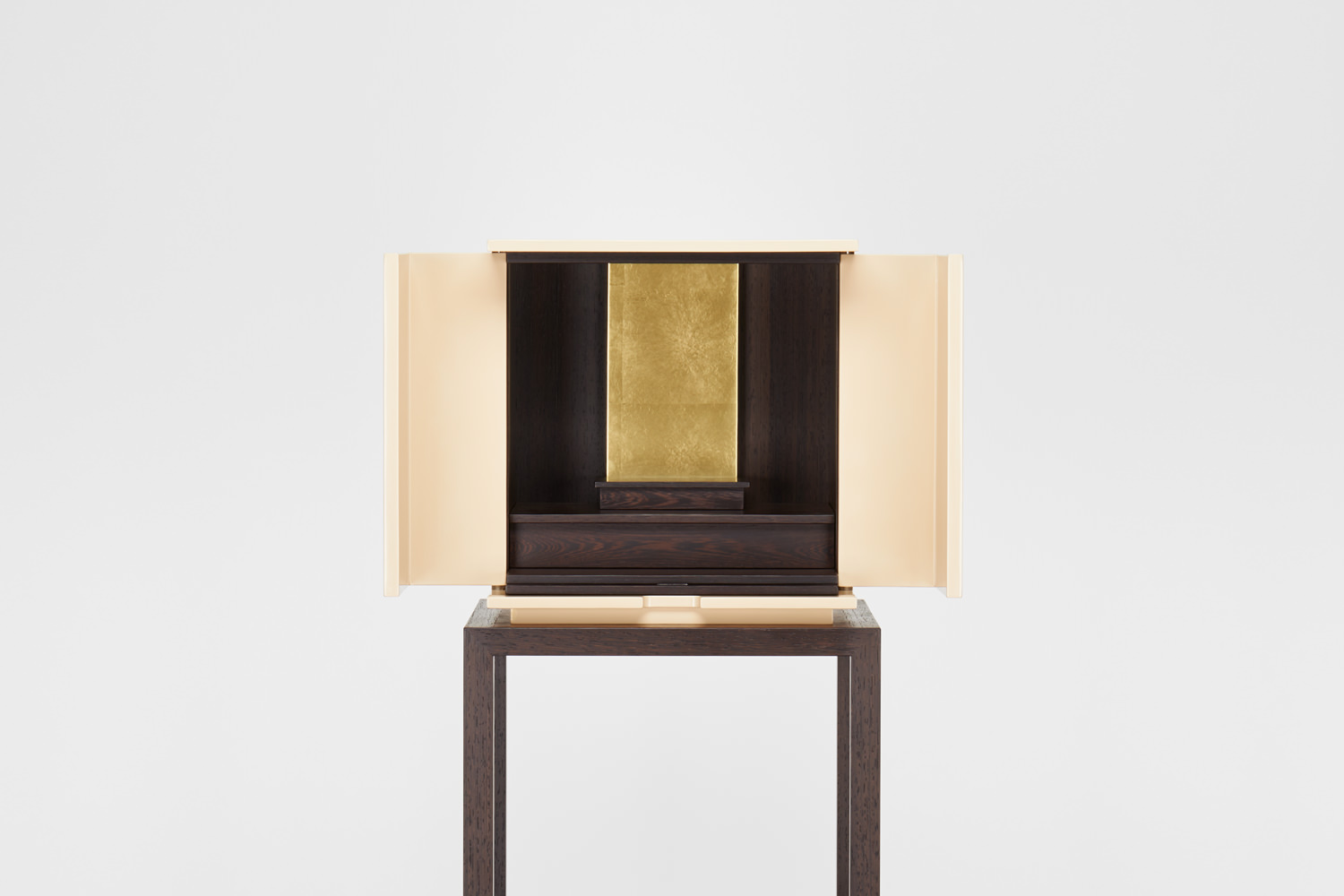 漆の色味が生きた落ち着きのある白漆は、和から洋にいたるさまざまな空間にしっくりと馴染み、漆の光沢が豊かさを与えてくれます。須弥壇は引き出しになっており、骨壺やお線香、ローソクなどを収納できます。向板は、金箔とウェンジ材の両面仕立てで、お客様の宗派や好みに合わせて変えることができます。