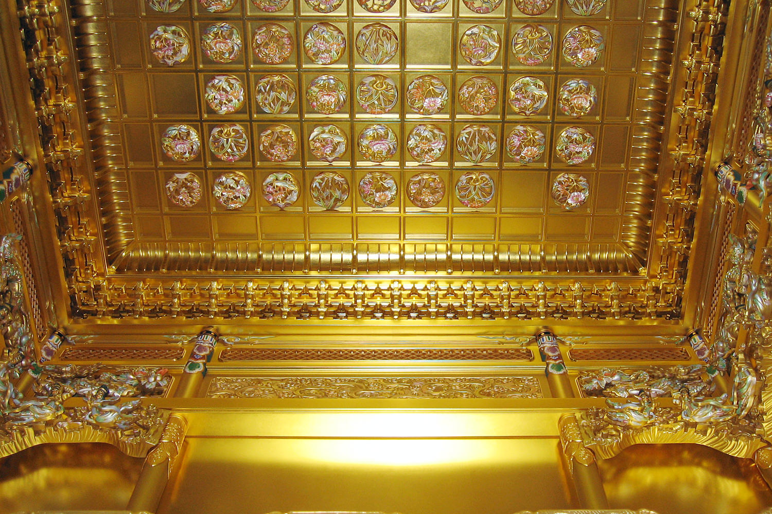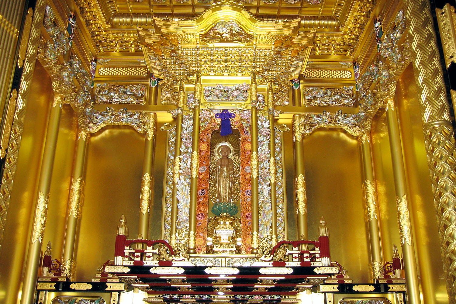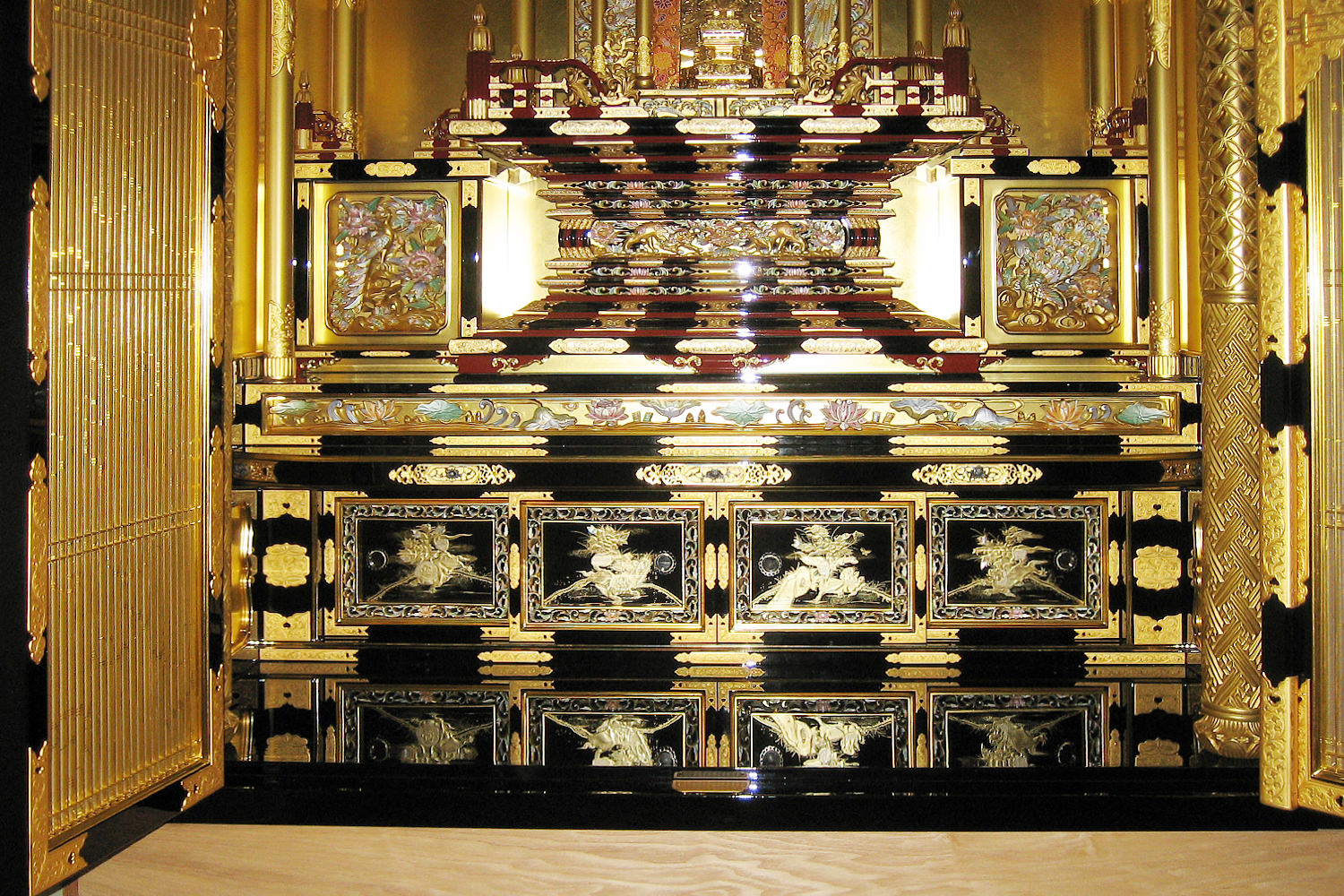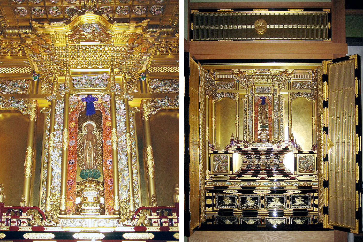 こちらは、寺院内の庫裡(くり)に設けられた御内仏で、一間仏間の浄土真宗本願寺派の仕込み仏壇になります。ご住職がお持ちのご本尊(仏様)の高さに合わせて、宮殿の高さを割りだし、仕込み仏壇全体のバランスを調整して設計しています。天井や宮殿の彫刻には、金箔を押した上に岩絵具で極彩色を施しています。