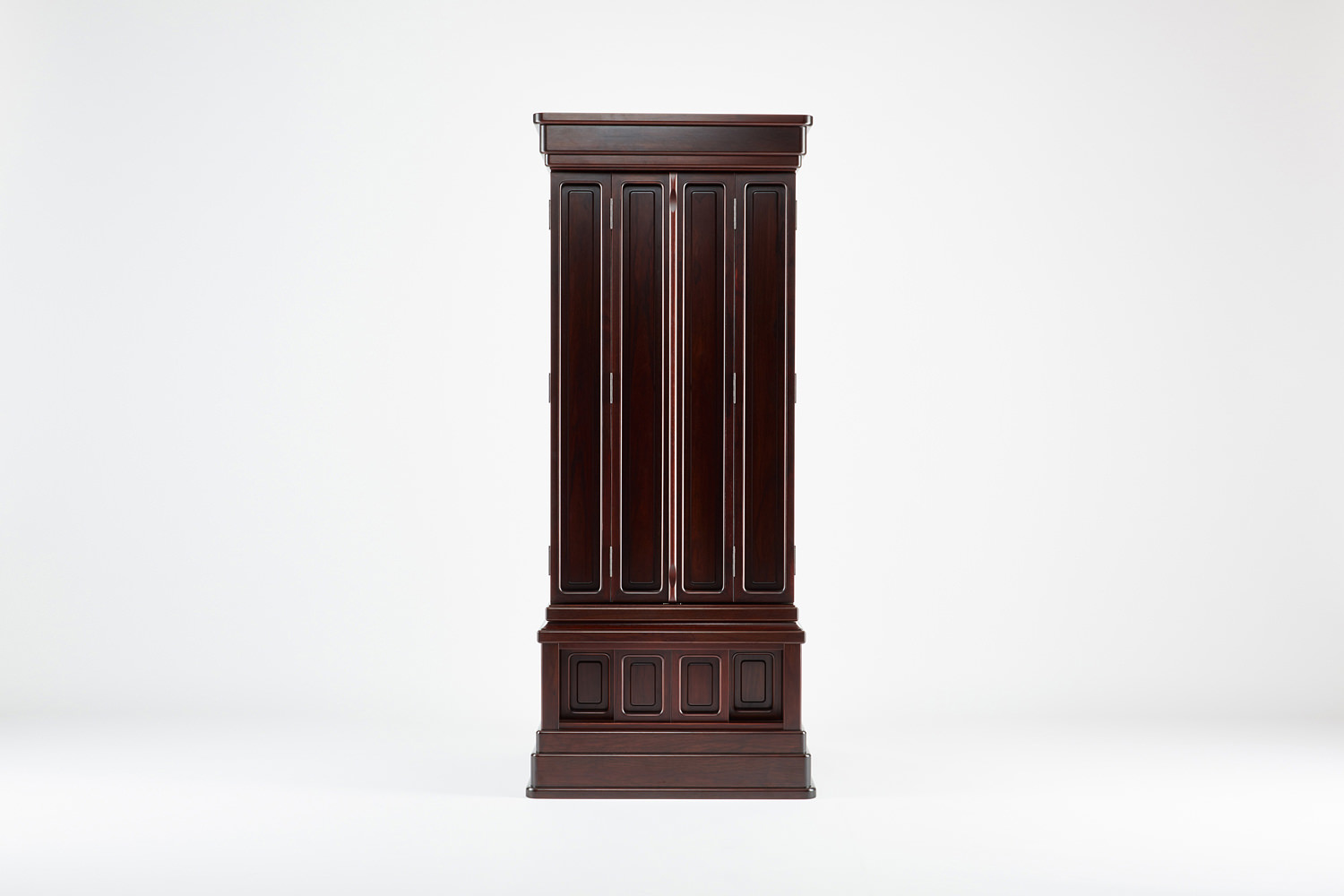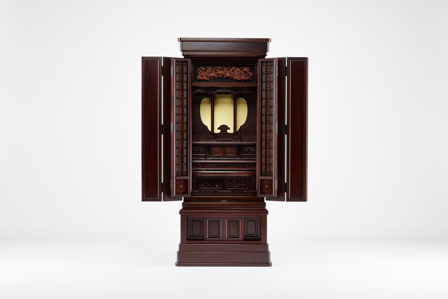 稀少な高級材、紫檀(シタン)を用いた国産のお仏壇。紫檀材の深みをさらに生かすために天然漆を摺り上げた仕上げになります。その深みのある凛とした外観とは対照的に、扉を開けたときに見える内背板のやわらかな曲線の輪郭や力強い欄間の木地彫りが手を合わせる方に温もりを感じさせてくれます。