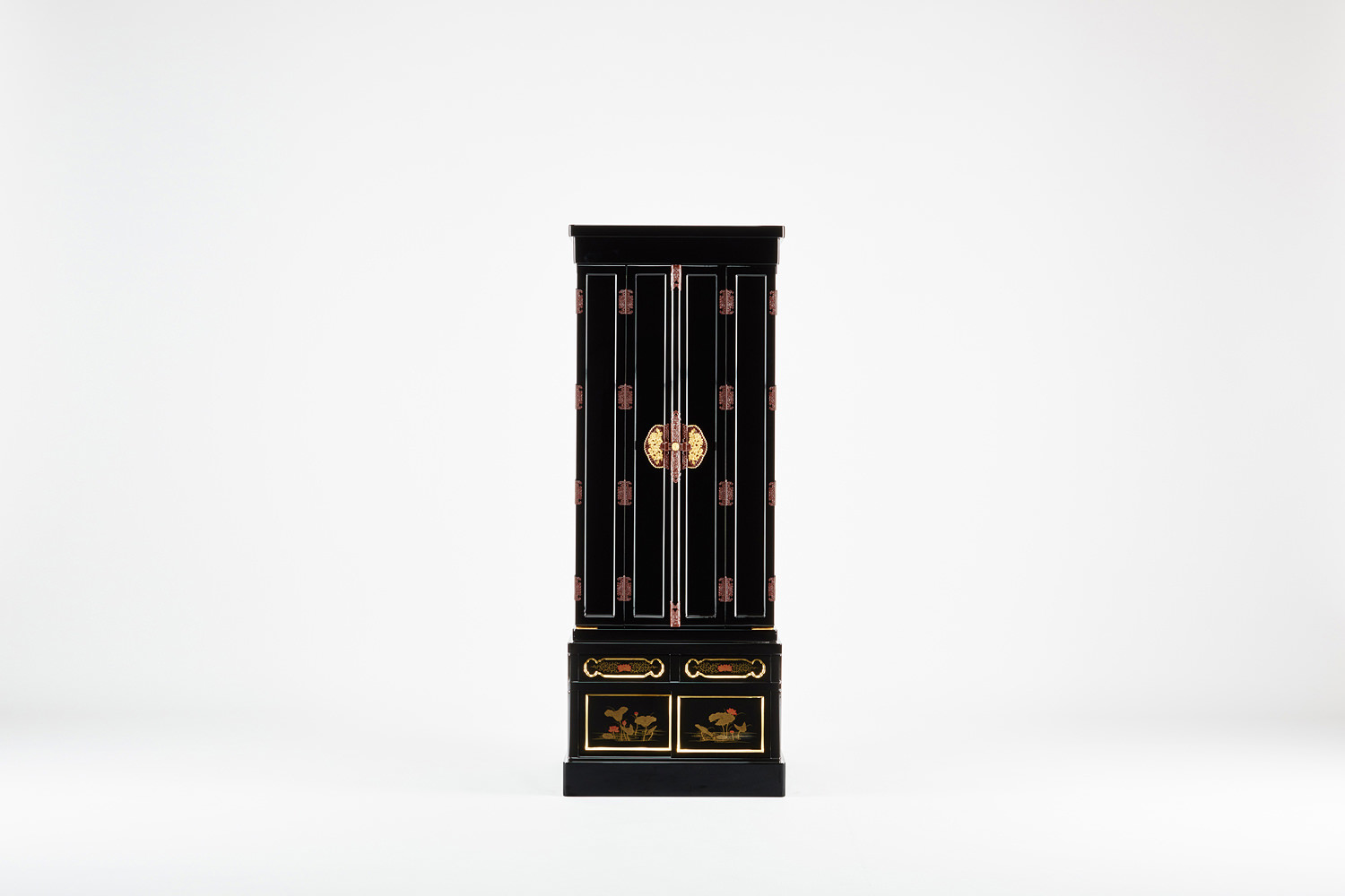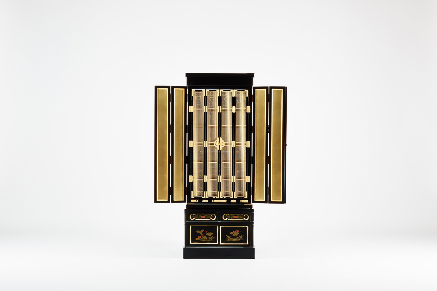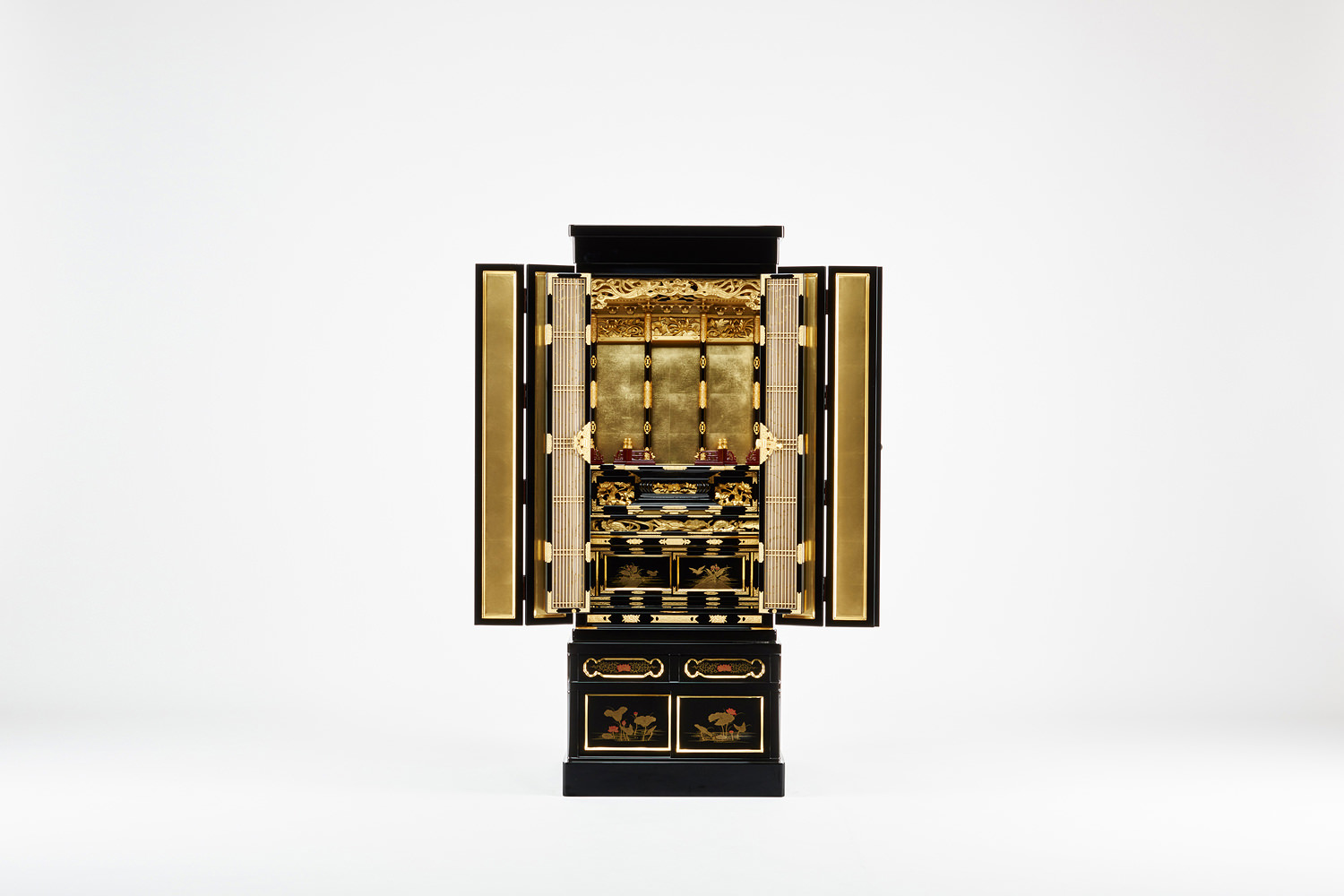 仏間のないご家庭にも気軽に置いていただける国産の塗仏壇。お手頃な価格で、しっかりとした屋根の造りと繊細な蒔絵を設えています。