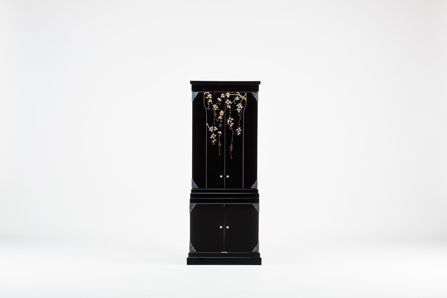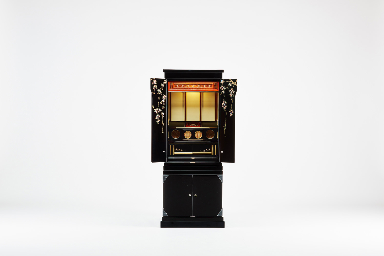 さまざまなお客様の要望をもとに出来上がった国産の現代型塗仏壇。扉には、春を感じさせる色彩豊かな“しだれ桜”の蒔絵を描き、内部は深い赤と黒漆が互いを引き立て、華やかで落ち着いた雰囲気を演出します。内天井にはダウンライトを取り付け、中央のご本尊様を明るく照らし、柱のうるみ塗りも美しく輝きます。