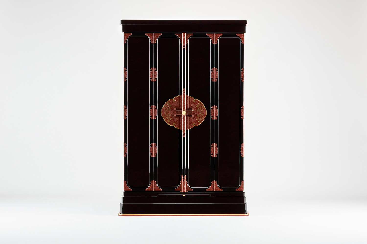 長い歴史の中で育まれてきた「彦根仏壇」のダイナミックさと繊細さを融合した西本願寺派(お西) の国産仏壇。本漆塗り、純金箔、純金粉を使って製作しております。蒔絵箇所は、皺箔技法の上に蓮の彩色蒔絵を描き、趣きのある落ち着いた質感に繊細な色彩を感じさせる仕上げになっています。