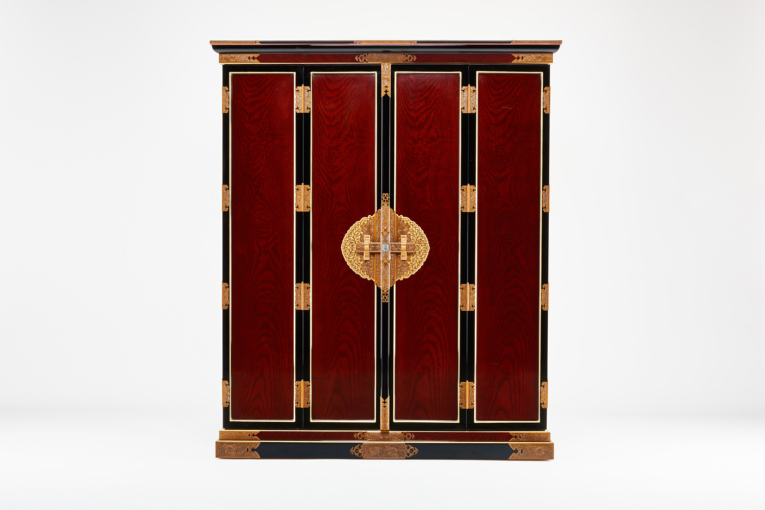 一間仏間用の国内最高級浜仏壇。材質から塗り、彫刻、蒔絵、組立にいたる全ての工程にこだわり抜いたお仏壇です。宮殿前の小柱には、純銀の絵金具が取り付けてあります。 最高級と称される浜壇の由来は、古くは豊臣秀吉が滋賀県の長浜城城主であった頃、地元の町に12体の曳山(山車)を造らせました。当時名手と言われた職人が取り組んだ曳山は、現在でも重要文化財として扱われています。その曳山の製作に携った職人が造り始めたお仏壇のかたちが“浜壇”と呼ばれています。
