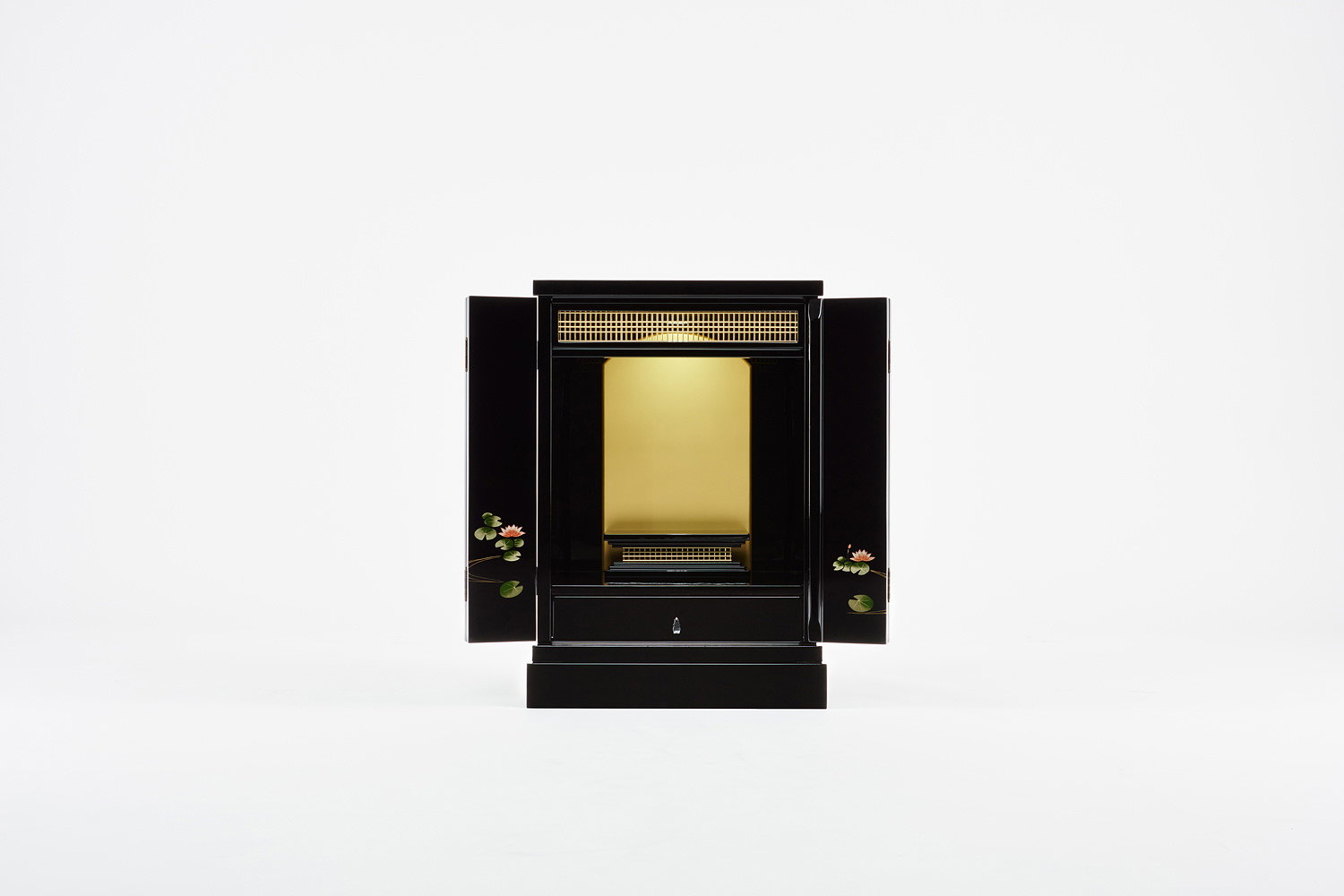 国産の小型塗り仏壇。扉に蓮の手描きの蒔絵を施し、内部の欄間や須彌壇に格子のデザインを取り入れることで、透け感のあるすっきりした印象を与えます。小型仏壇ですが、内部のスペースはゆとりがありますので、お位牌も数本置くことができます。