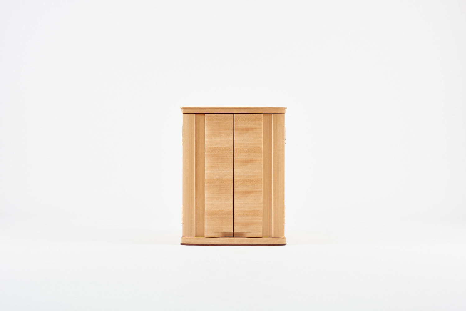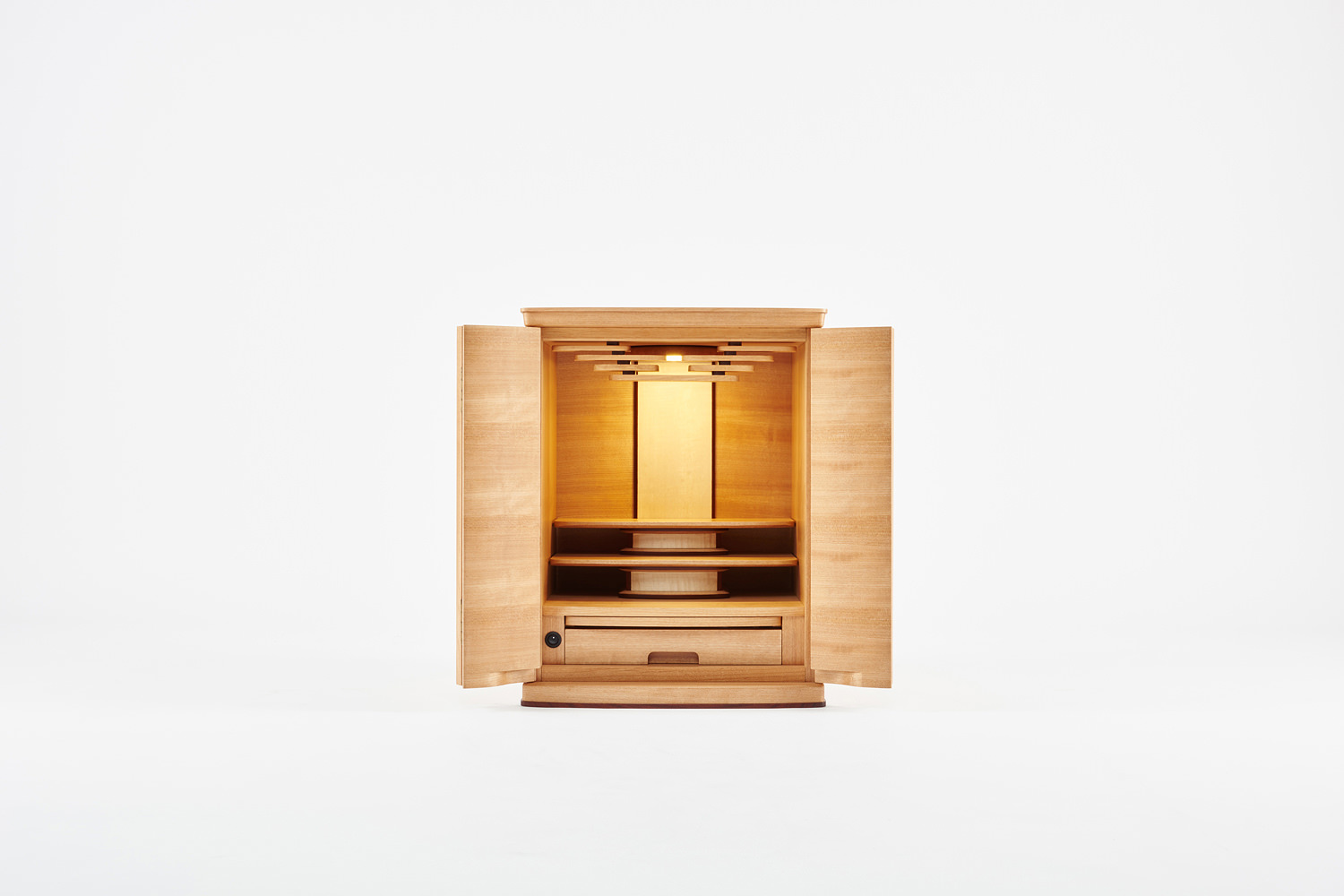 装飾的な意匠を省きながらも、須彌段周りのゆるやかな曲線、観音扉のカーブがやわらかな印象を与えます。透かしのある前欄間の比率、角の曲面など細部に至るまで、丁寧に仕上げています。内部の向板には、気品あるシカモア材、縁材にカリン材を使い、2種の木材のコントラストとLED照明の効果でより一層魅力的な宮殿となっています。ほんのりと香る桜材のかおりが、優しく包まれる様な心地にさせてくれます。