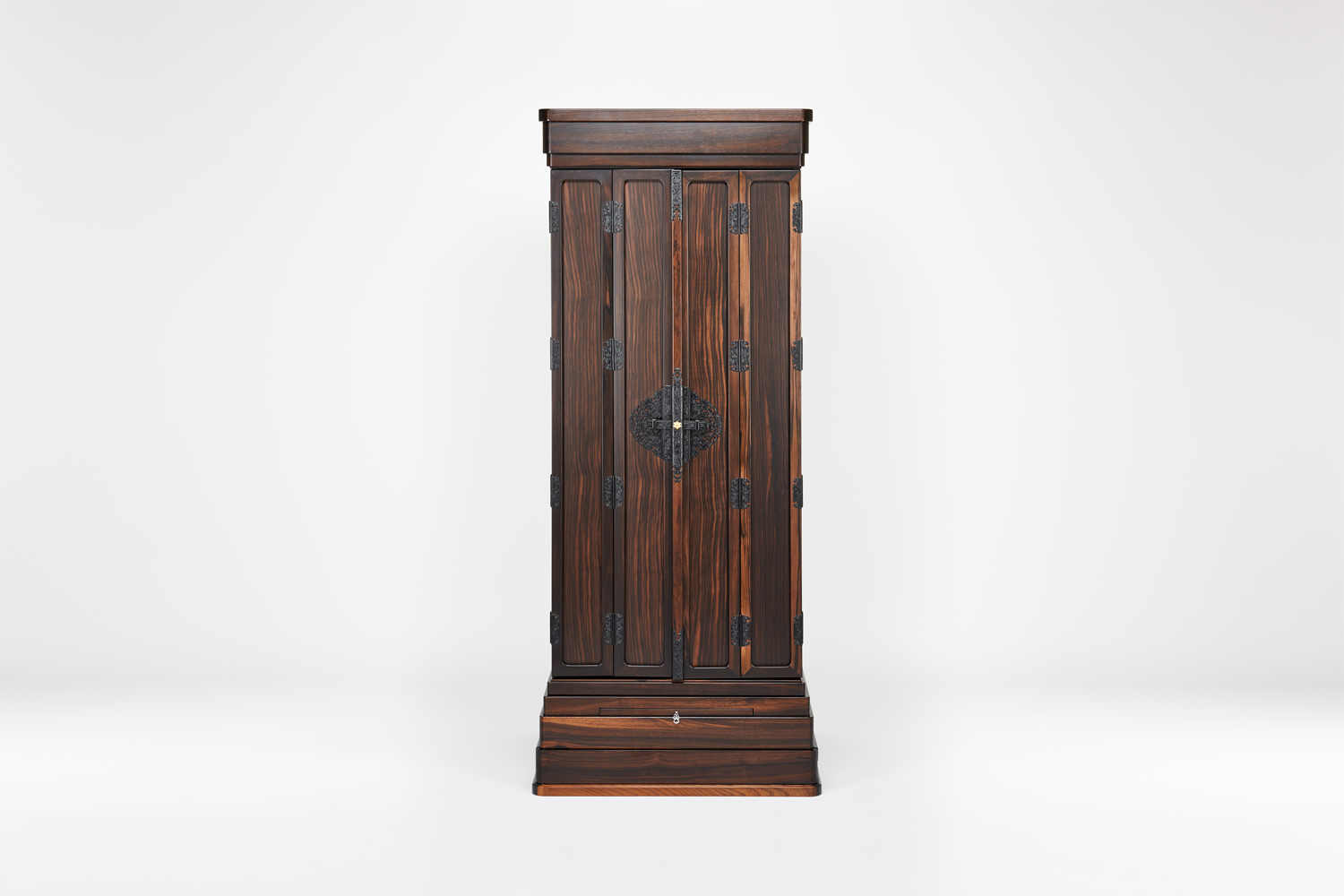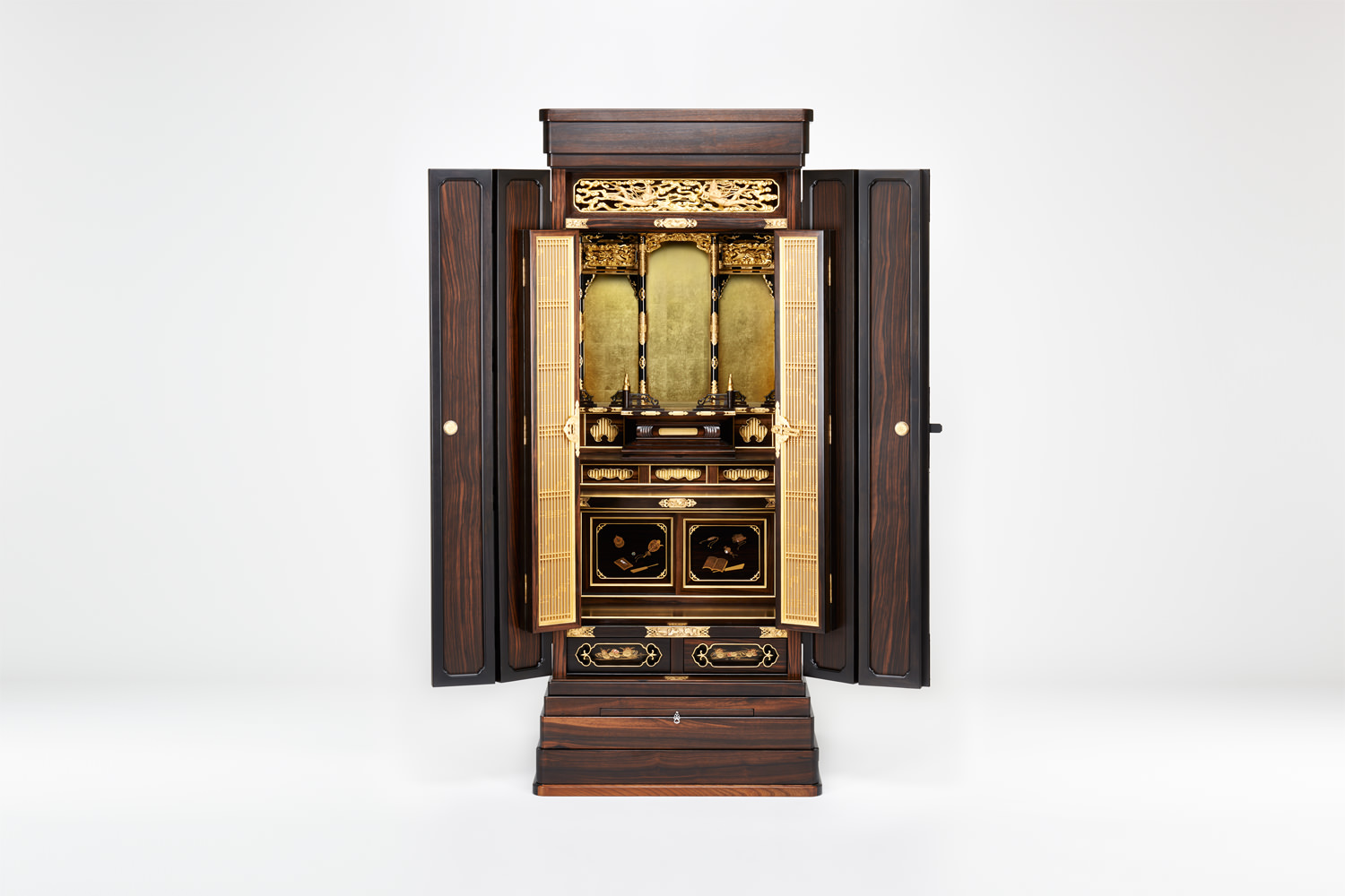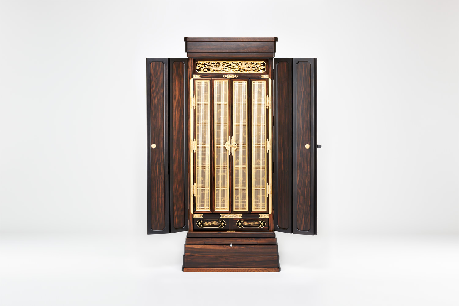 稀少な高級材である黒檀材を用いた本格的な真宗大谷派(お東) のお仏壇。伝統的なお仏壇の基本を軸として、黒檀の素材としての魅力を活かした造りです。本金箔、本金粉を駆使し、前欄間には雲天人の彫刻、蒔絵には研ぎ出し技法による“宝づくし”を施したこだわりの創作仏壇です。
