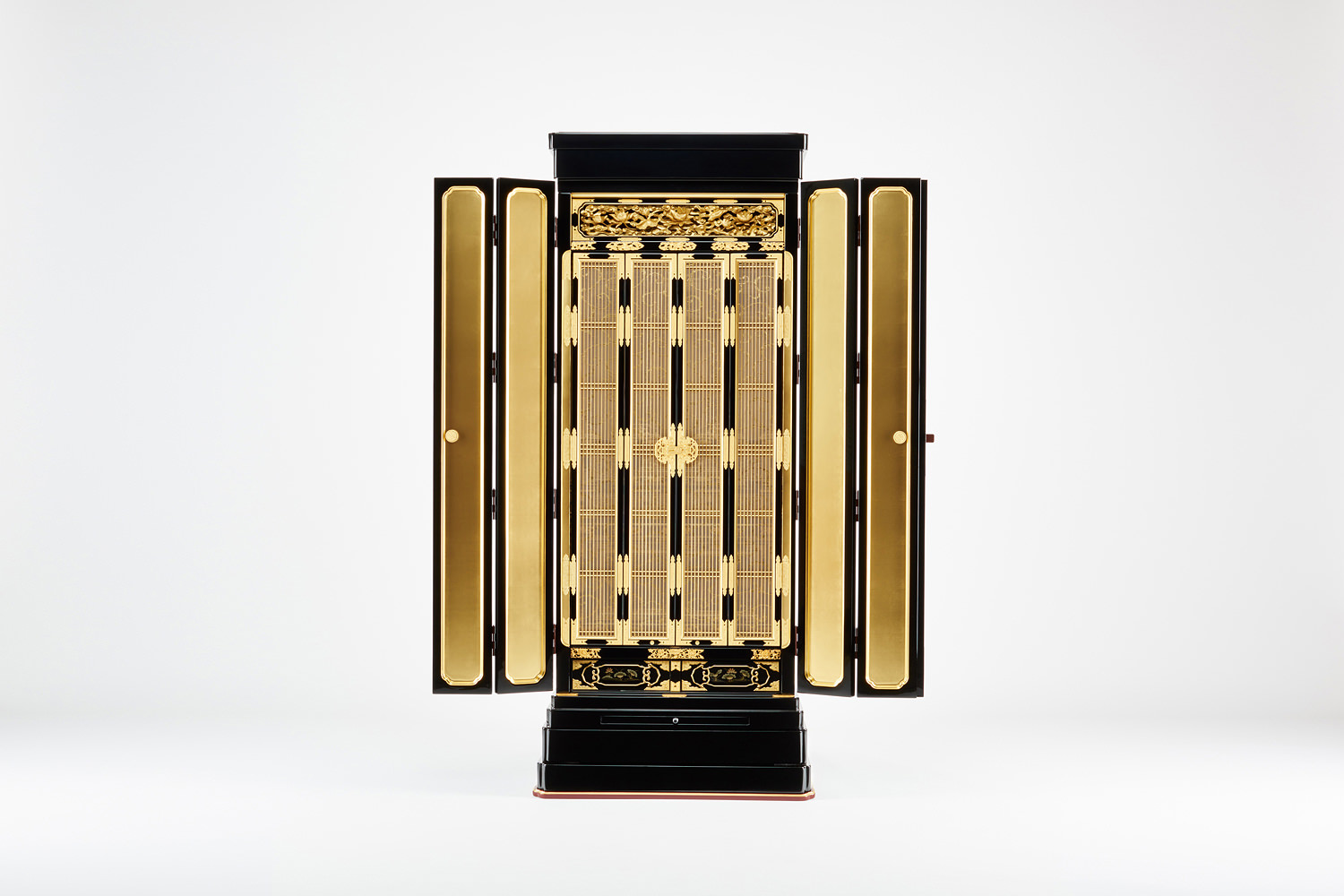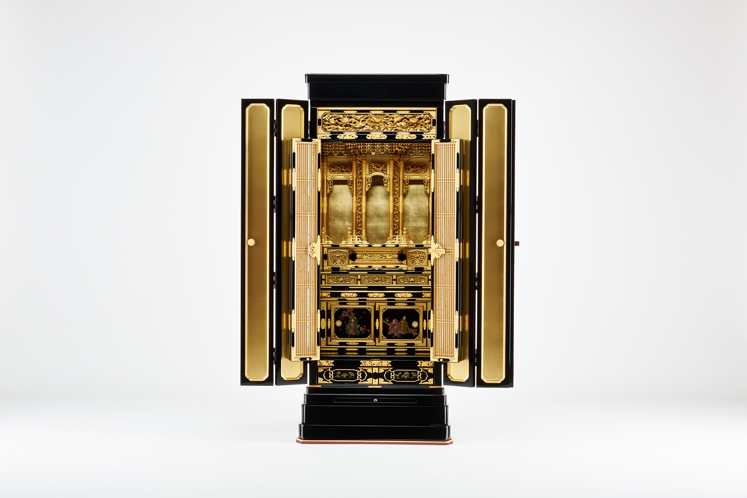 本うるし塗り、本金箔仕上げで繊細な造りこみの浄土真宗本願寺派(お西) のお仏壇。表現豊かな手描きの研ぎ出し蒔絵が特徴的です。下台輪の二段目には、大きな引き出しが細工されていますので、収納にはとても便利です。